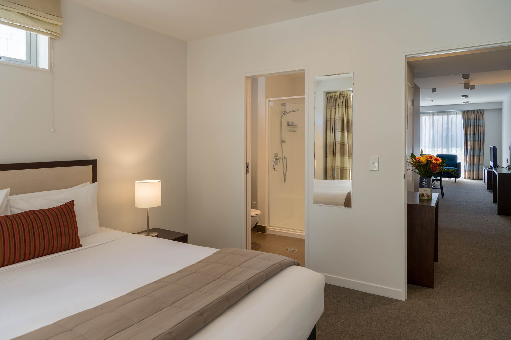 This one bedroom apartment features a queen sized bedroom, a separate study with single bed and dining/living area, located in our South Tower. These spacious and stylish apartments allow for a relaxing retreat, with all the benefits of home; including an outdoor balcony, fully equipped kitchen, laundry facilities, Nespresso coffee machine and complimentary WiFi.
